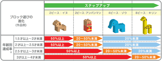 まずは、ブロックを並べる遊びから始まり、2個のブロックの組み立て、さらに4個の組み立てと成長していきます。